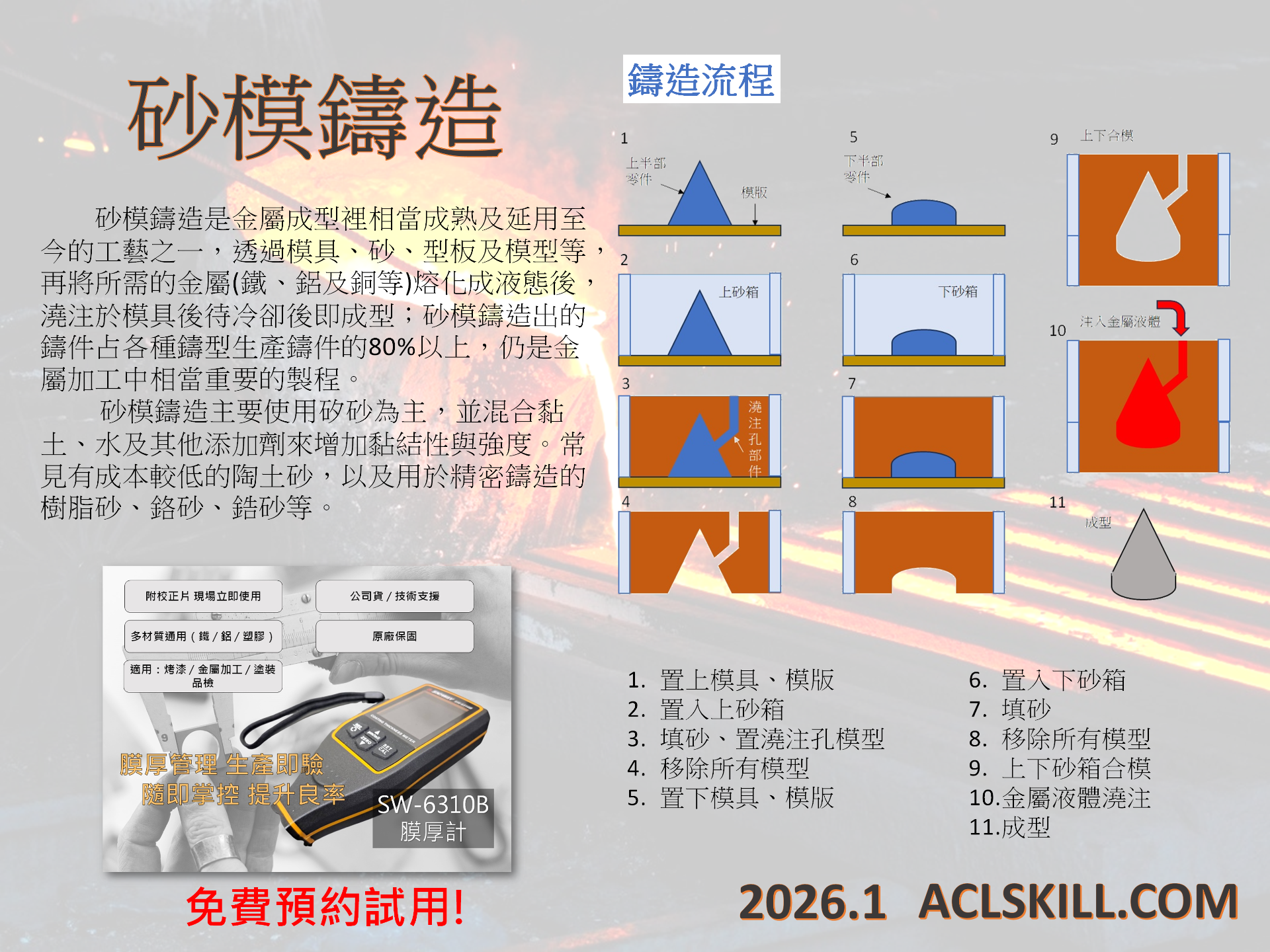 砂模鑄造是金屬成型裡相當成熟及延用至今的工藝之一,透過模具、砂、型板及模型等,再將所需的金屬(鐵、鋁及銅等)熔化成液態後,澆注於模具後待冷卻後即成型;砂模鑄造出的鑄件占各種鑄型生產鑄件的80%以上,仍是金屬加工中相當重要的製程。