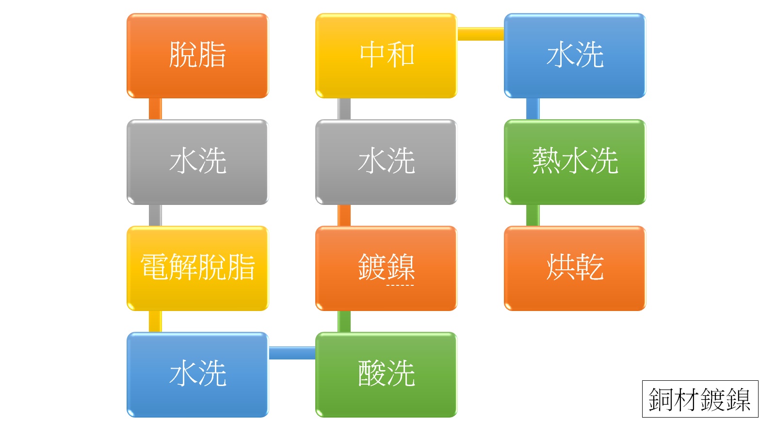 滾鍍的製程中有許多材料的處理應用,如銅材鍍鎳、鐵材鍍鎳或不鏽鋼鍍鎳等,在此我們舉銅材鍍鎳來了解其製程內容(如下所示);製程中不外乎先將工件藉由脫脂去除髒汙,為了讓表面潔淨度更好一般會再追加電解脫脂,接下來便是進行鍍鎳。