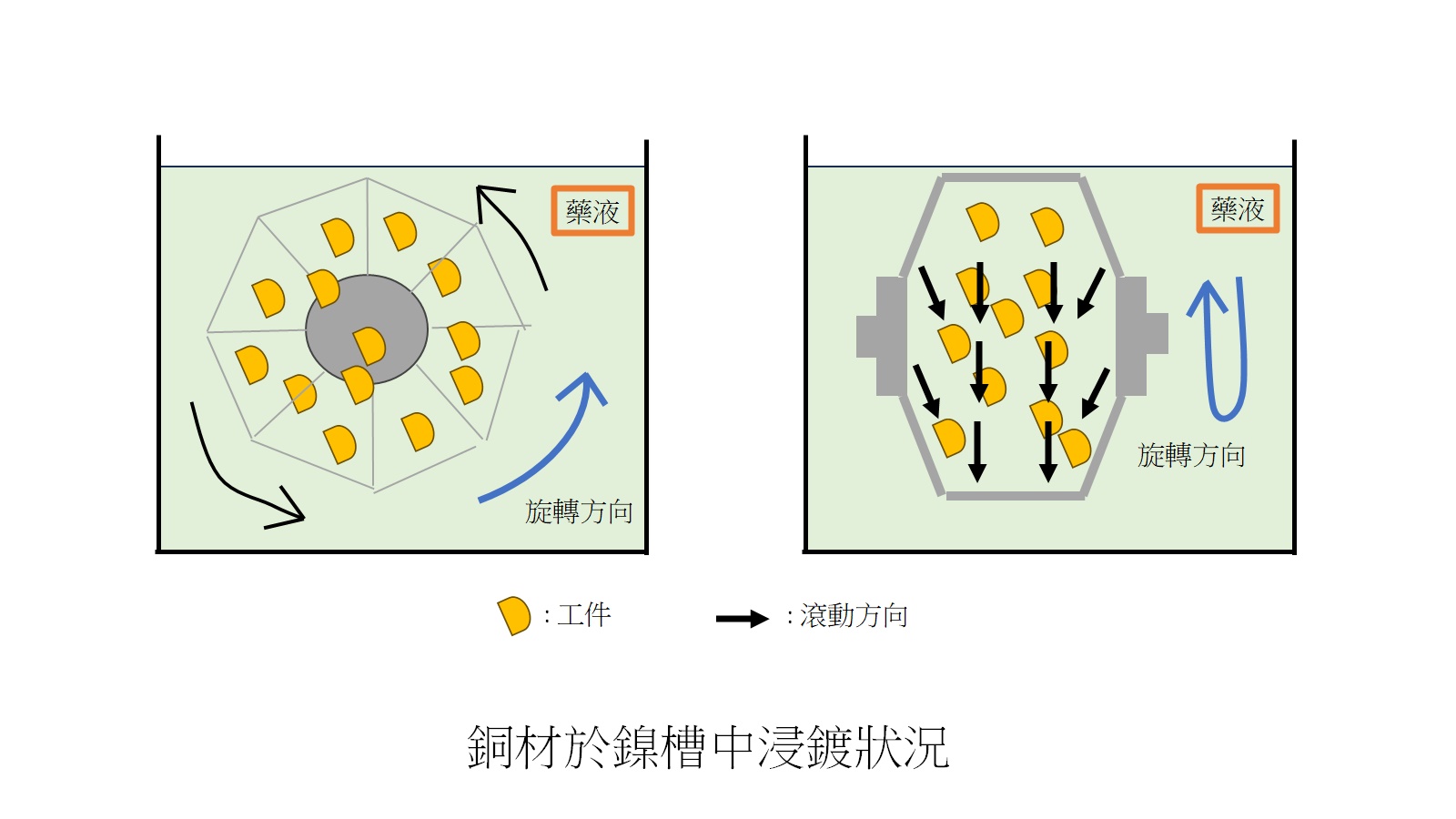 螺絲、螺帽、墊圈、小型五金件、電子小零件等相關工件,則適用於滾鍍製程,但如果工件結構複雜、表面不能有外傷及有膜厚均勻度的要求,則不適用於滾鍍而需要評估其它製程。